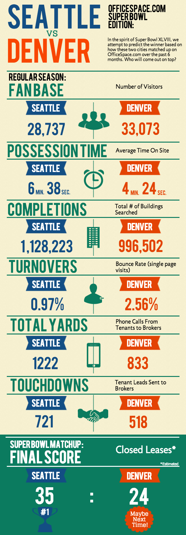 Take a look at our infographic below to see how Seattle and Denver matched up on OfficeSpace.com over the past 6 months (and who we think is going to win it all this Sunday)!