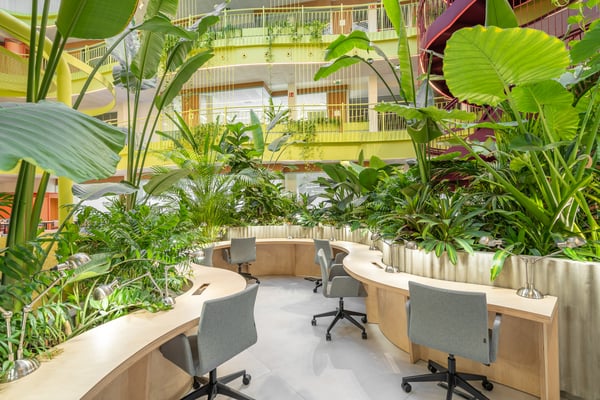 utopic_US offers a sustainable and flexible workspace in Madrid’s prestigious Chamartín financial district. Thoughtfully designed by Binom Architects, the space draws inspiration from the classic English pleasure garden, creating a welcoming environment for modern businesses.