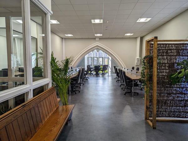 Step into a distinctive workspace set within a beautifully restored chapel in Clifton, where historic architecture meets modern sustainability. The available private office accommodates up to 16 people, featuring original stained glass, soaring ceilings, and plentiful natural light enhanced by lush greenery.