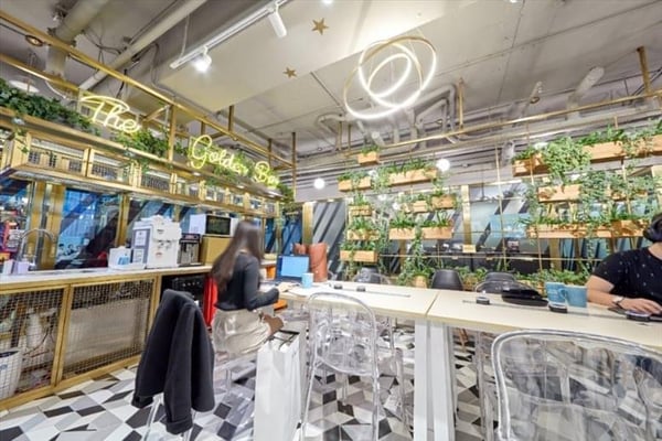 Situated in the heart of Admiralty, this workspace offers an inviting environment for professionals seeking a central Hong Kong address. The interior features elegant gold-toned metal accents and a striking green wall, creating a vibrant yet sophisticated atmosphere. Unique touches, such as a swing, add creative flair to the setting.
