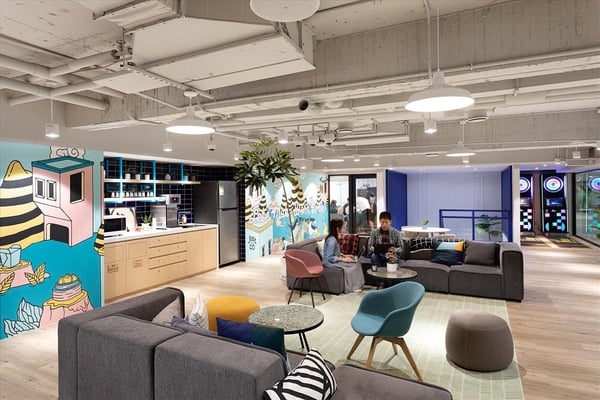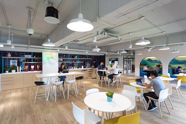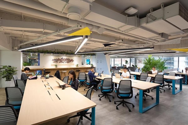 JustCo offers a contemporary work environment in the heart of Songshan District, providing seamless access to public transportation and an array of local amenities, including banks, fitness centers, shopping, and diverse dining options. The workspace spans two interconnected floors, designed to maximize natural light in communal areas and provide inviting lounge seating for collaboration or relaxation.